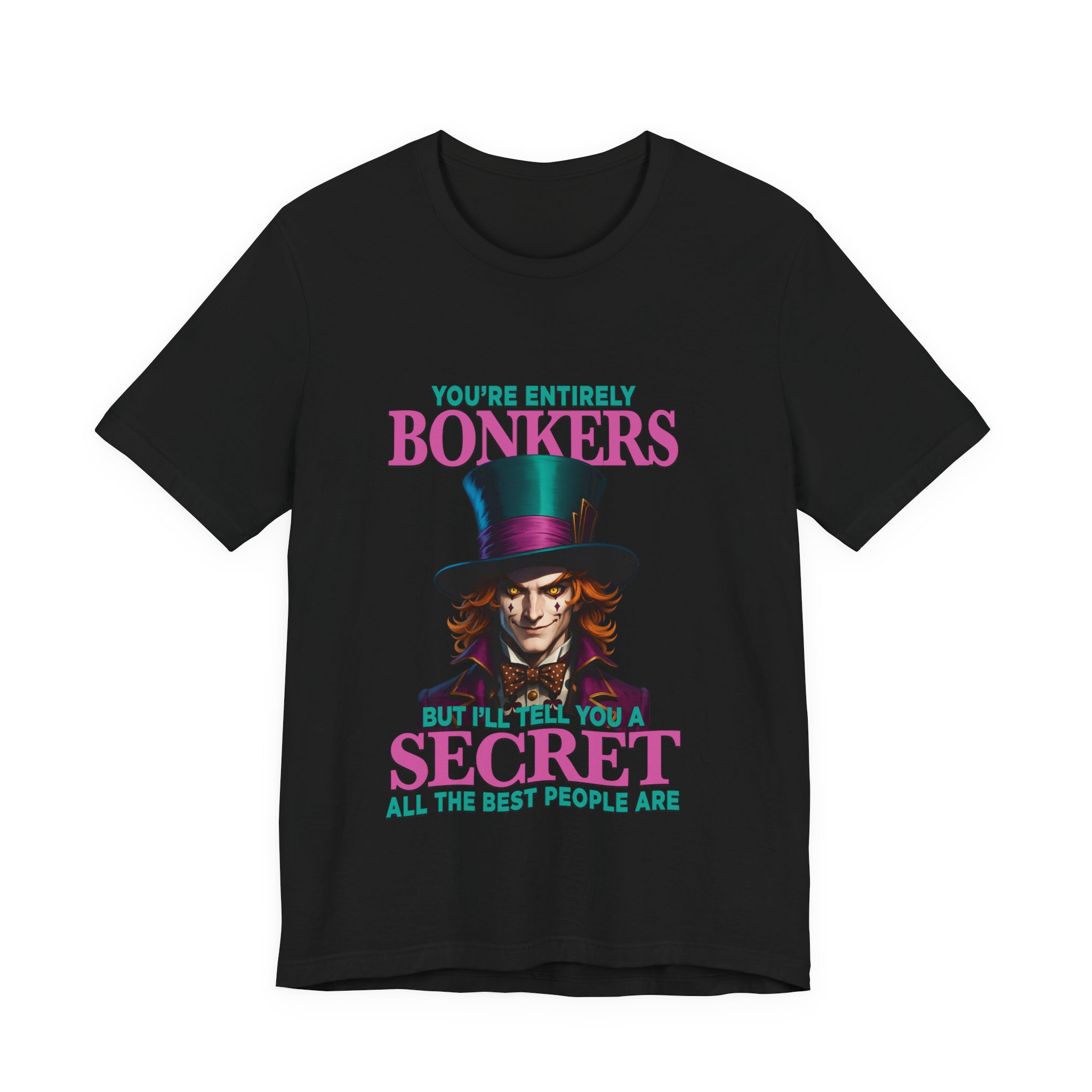 This lightweight, breathable tee carries a playful, slightly mischievous vibe—bright, vintage-inspired lettering and a charismatic Mad Hatter–style portrait declare: “You’re entirely bonkers… but I’ll tell you a secret: all the best people are.” It sits cleanly at the crew neckline and keeps shape with side seams and shoulder tape, so the design stays centered whether you wear it out with friends or layered under a jacket. The soft Airlume combed and ring-spun cotton feels gentle against skin, and the tear-away label removes irritation. Ethically produced and REACH certified, this shirt balances bold personality with everyday comfort for someone who enjoys quirky, conversation-starting wardrobe pieces.